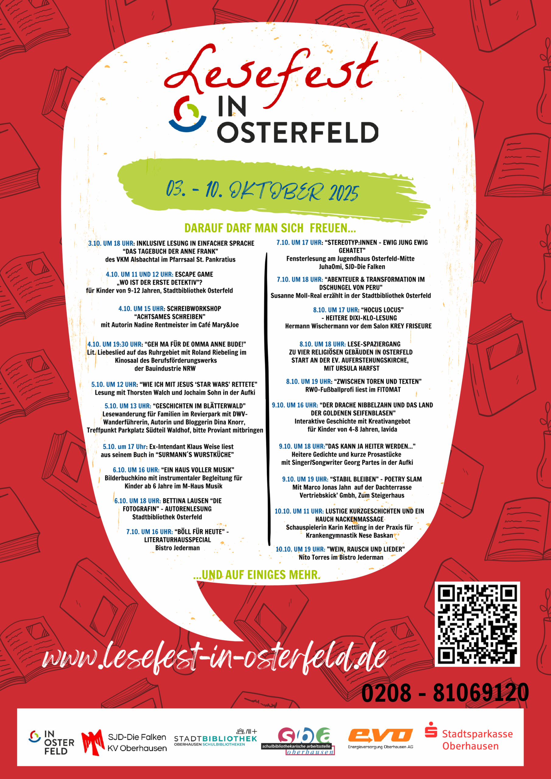 Das Lesefest in Osterfeld lädt eine Woche lang an verschiedenen Orten zum gemeinsamen (Vor-)Lesen ein. Es verbindet Menschen durch Sprache, schafft Räume des Austauschs und eröffnet neue Perspektiven. Neben der Förderung der Lesekompetenz geht es vor allem um Zuhören, Diskussion und gegenseitige Inspiration. Ziel ist es, ein jährlich wiederkehrendes Kultur-Event zu etablieren, das Wissen, Erfahrungen und Ideen miteinander teilt und weiterentwickelt.