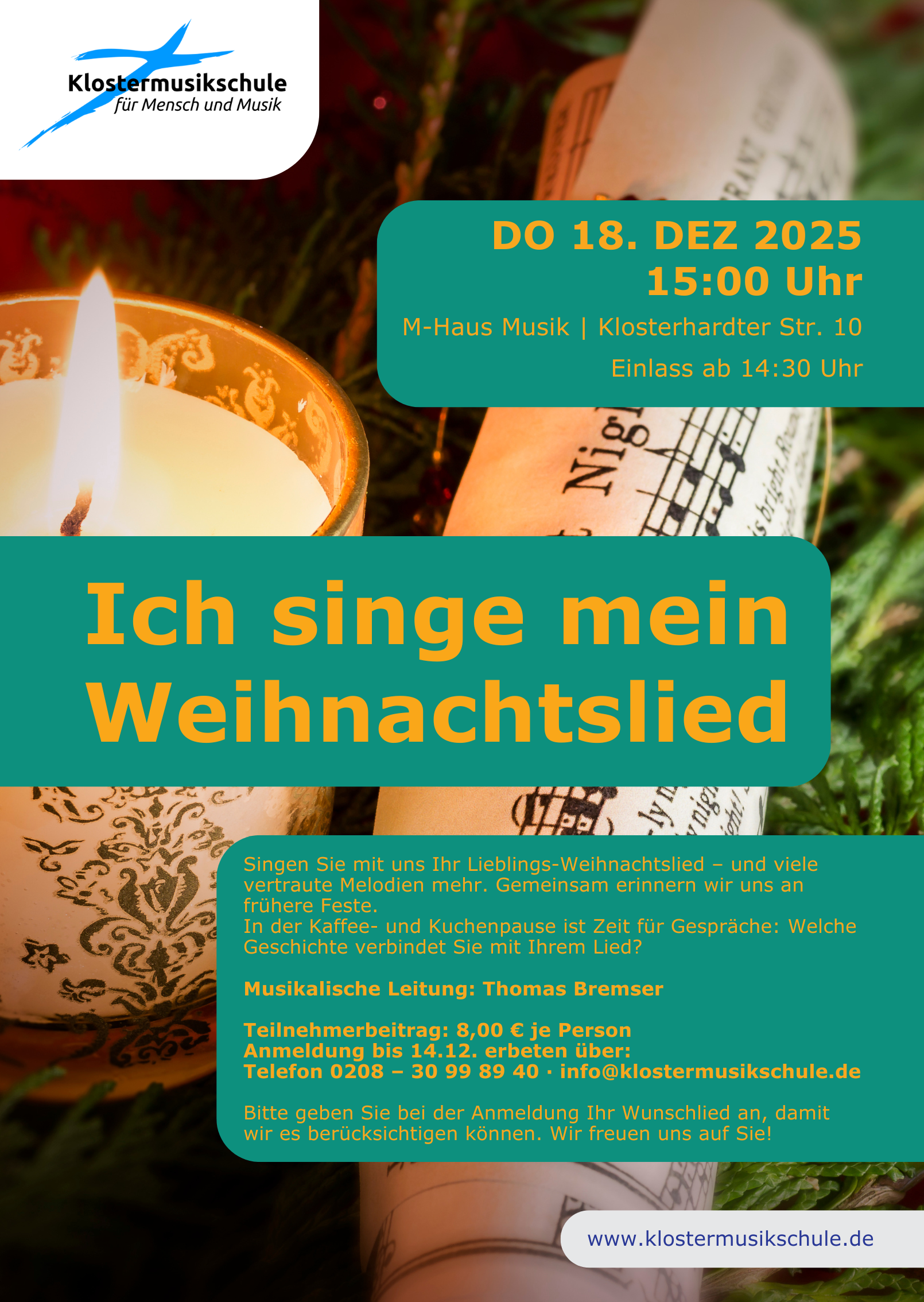 Die Adventszeit ist eine Zeit der Besinnung, der Begegnung – und für viele Menschen auch der Einsamkeit. Die Klostermusikschule lädt daher am 18. Dezember 2025 um 15 Uhr zu einem offenen Nachmittag unter dem Titel „Ich singe mein Weihnachtslied“ ein. Die Veranstaltung richtet sich vor allem an Seniorinnen und Senioren, steht aber allen Musikfreundinnen und Musikfreunden offen.