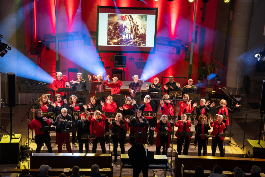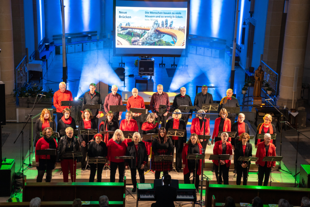 Zur äußerst engagierten Aufführung kamen sowohl bekannte Gospels (Oh Happy day , Go down moses…), und andere Songs (True colors, Viva la vida…), Lieder aus der Filmmusik (Skyfall) und von bekannten Interpreten (Lindenberg, Westernhagen…) als auch geistliche Lieder zum Mitsingen („Wir machen uns auf den Weg“). Visuelle Untermalung der Lieder auf einer großen Leinwand im Altarraum vertieften das musikalische und geistliche Erleben.
